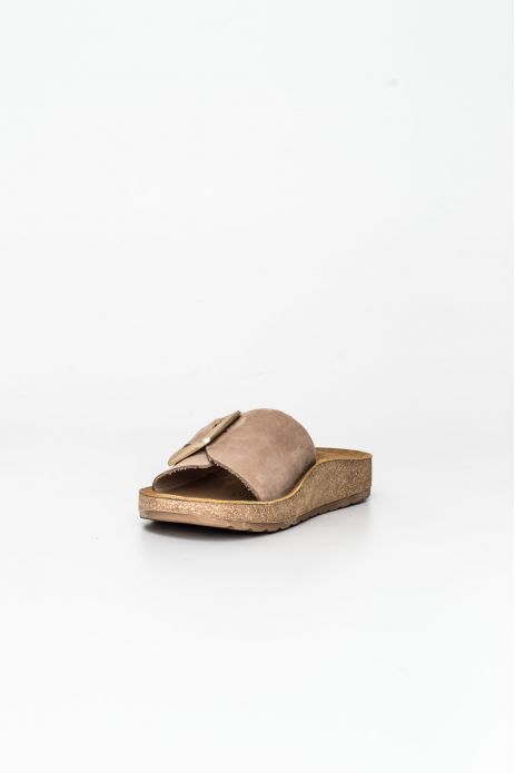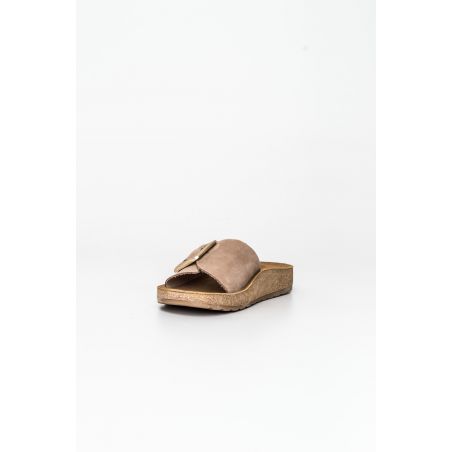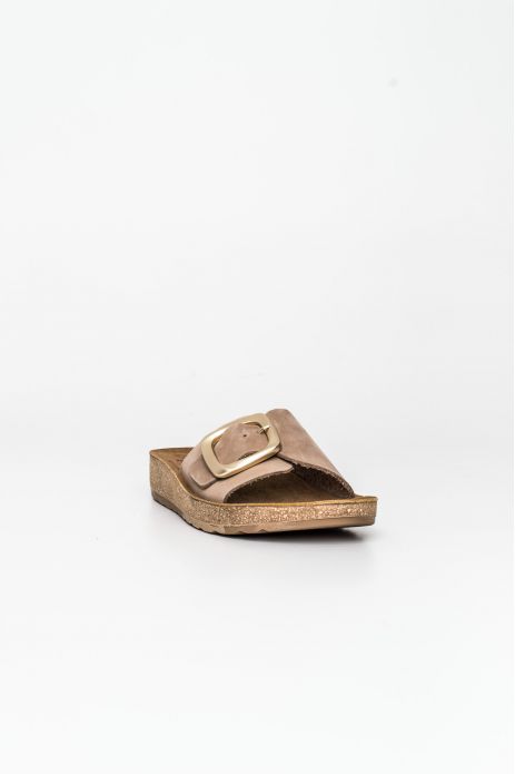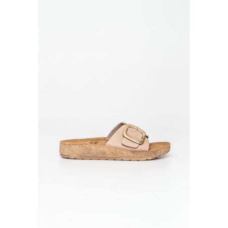 Sandalia bio Happy Monk fabricada con pieles naturales de acabado suave y destaca por su diseño de pala con una hebilla metálica de gran formato que aporta un toque de sofisticación.