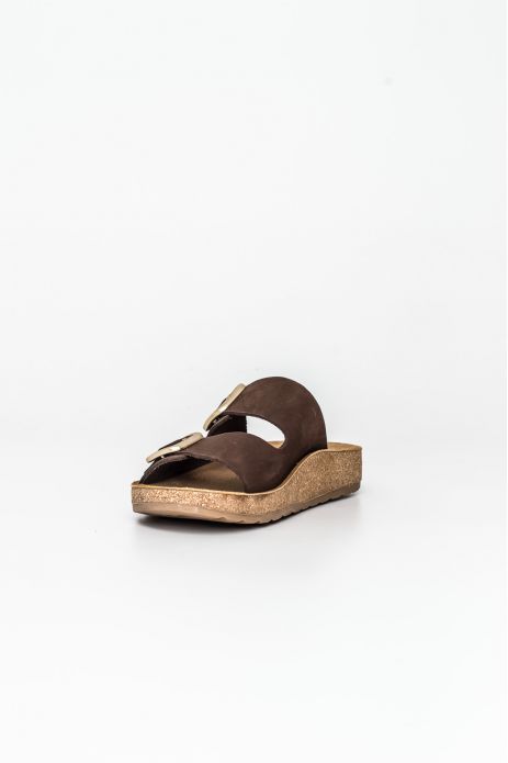 Sandalia bio Happy Monk fabricada con pieles naturales de acabado suave y destaca por su diseño de pala con una hebilla metálica de gran formato que aporta un toque de sofisticación.