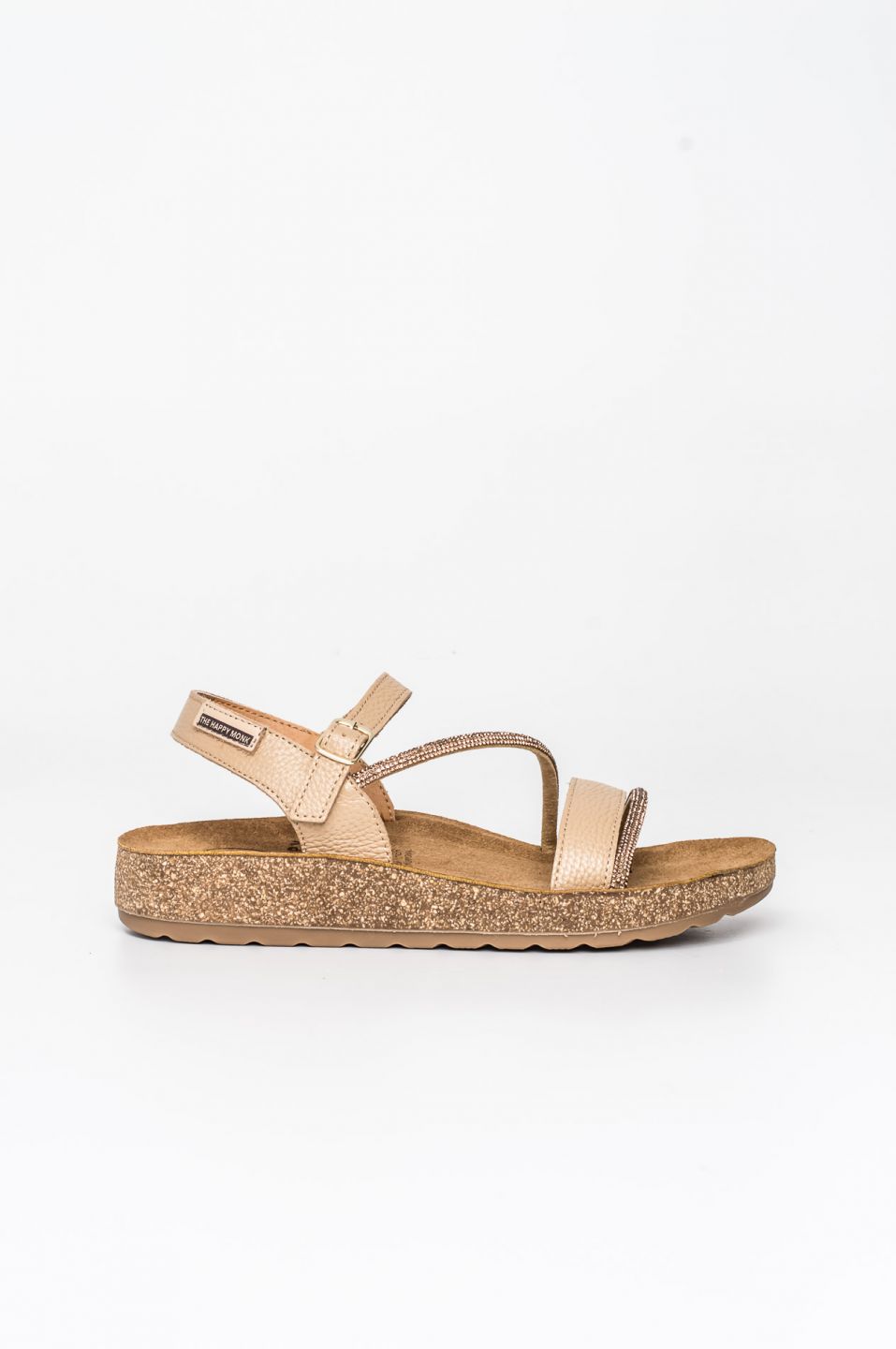 Sandalia bio Happy Monk fabricada con pieles naturales de acabado suave y destaca por su diseño de pala con una hebilla metálica de gran formato que aporta un toque de sofisticación.